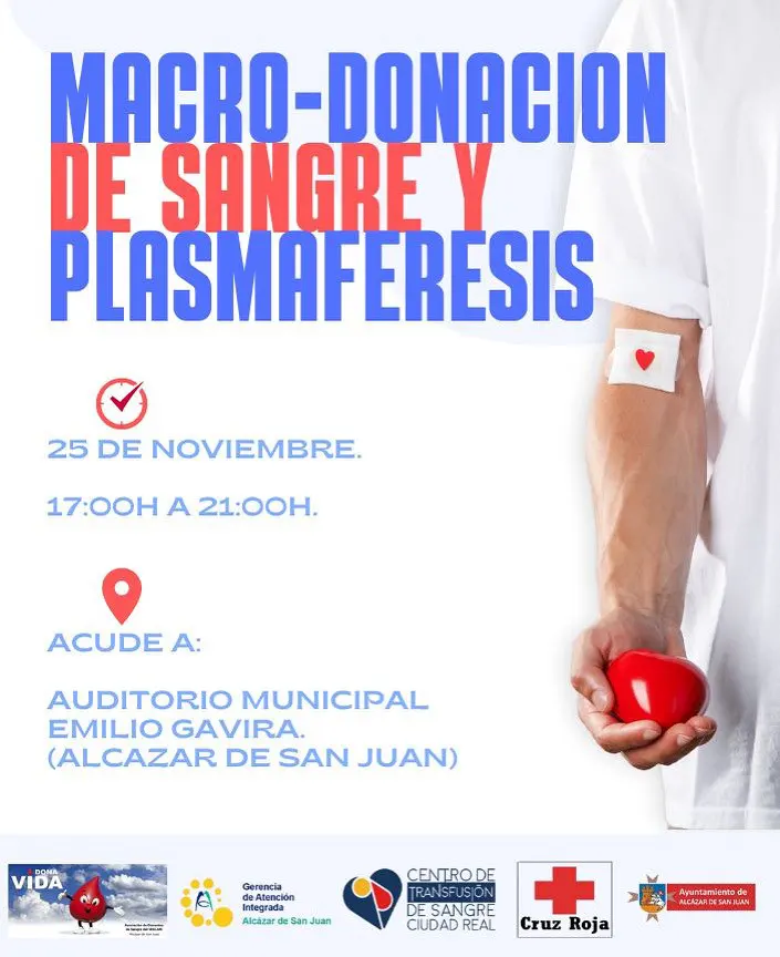 El próximo martes 25 de noviembre, el Teatro Emilio Gavira de Alcázar de San Juan se convierte en un punto clave para la vida: acogerá una macro donación de sangre y plasmaféresis, organizada por el Centro de Transfusión de Ciudad Real y la Asociación de Donantes de Sangre del SESCAM de Alcázar de San Juan.